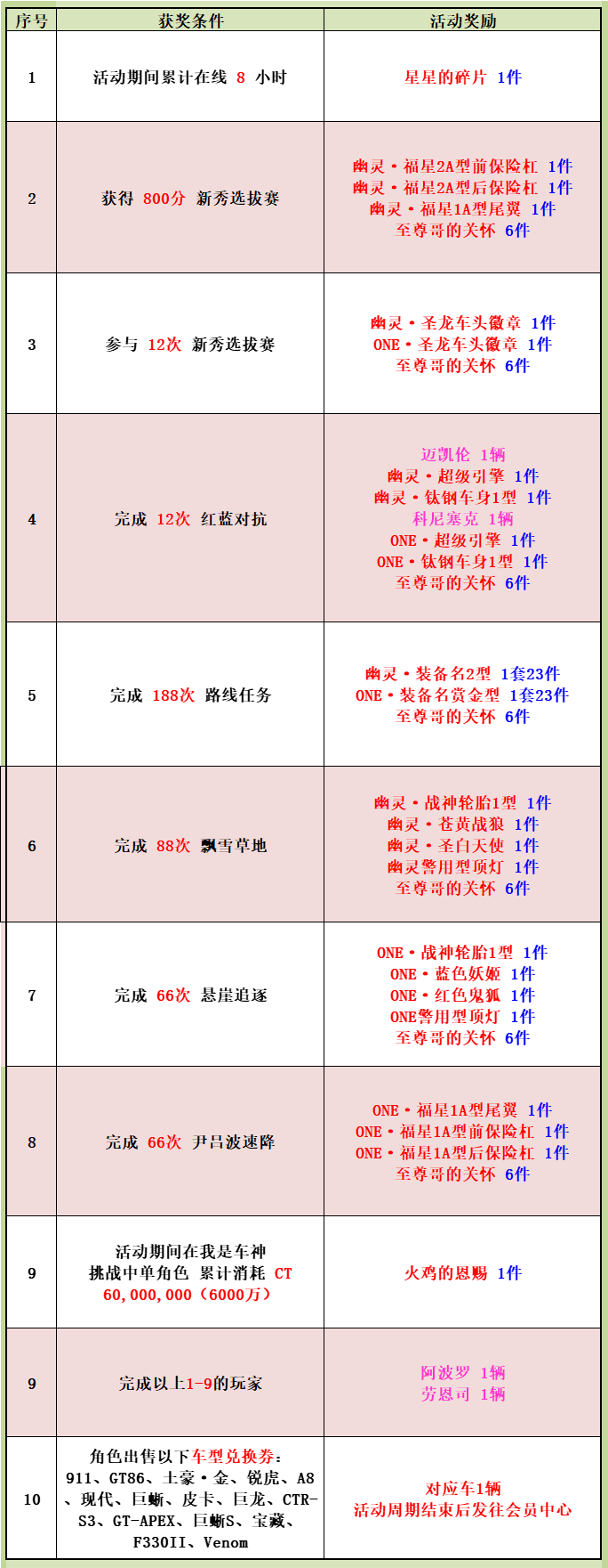 8. 序号8活动,我是车神统计以通行证下完成消耗最多的角色进行单独统计,只统计完成与否,不统计是否刷新记录,同一通行证多个角色完成只发放一份奖励;