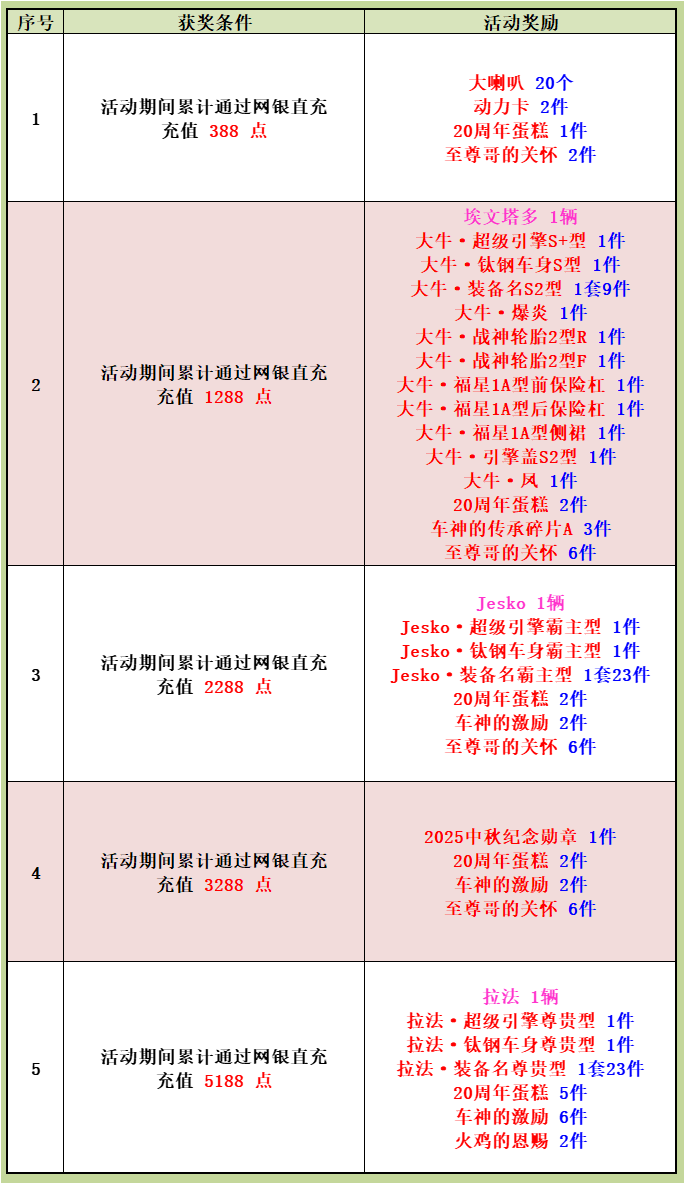 1. 序号1至5活动奖励由系统即时颁发,请在完成相应任务后于游戏中领取;