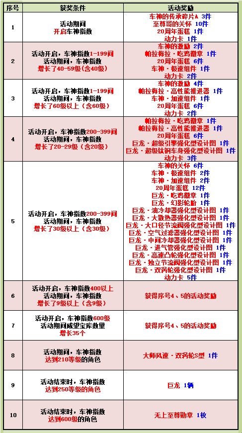 7. 活动序号2-3,必须在活动开始统计时已开启车神指数才可以参与,未开启的角色,活动期间开启只可以获得序号1的活动奖励(如活动开启前未开启,开启后升到了车神指数指定等级,只可获得序号1的活动奖励,无法获得序号2-3的活动奖励);