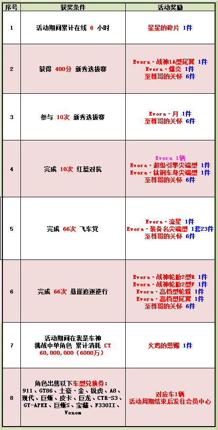 8. 序号7活动,我是车神统计以通行证下完成消耗最多的角色进行单独统计,只统计完成与否,不统计是否刷新记录,同一通行证多个角色完成只发放一份奖励;