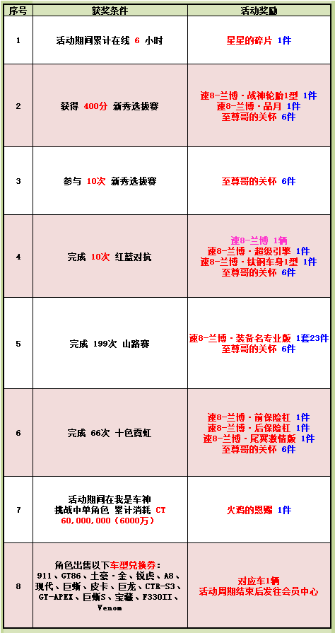 8. 序号7活动,我是车神统计以通行证下完成消耗最多的角色进行单独统计,只统计完成与否,不统计是否刷新记录,同一通行证多个角色完成只发放一份奖励;
