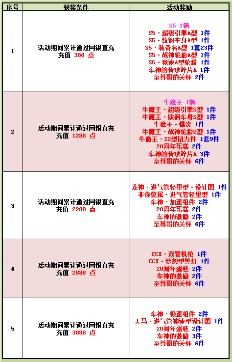 1. 序号1至5活动奖励由系统即时颁发,请在完成相应任务后于游戏中领取;