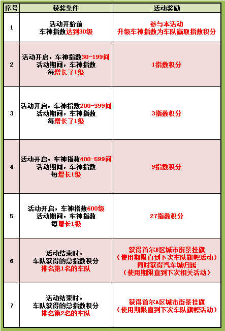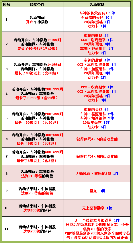 7. 活动序号2-3,必须在活动开始统计时已开启车神指数才可以参与,未开启的角色,活动期间开启只可以获得序号1的活动奖励(如活动开启前未开启,开启后升到了车神指数指定等级,只可获得序号1的活动奖励,无法获得序号2-3的活动奖励);