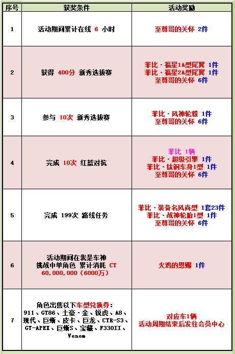 9. 序号7活动,角色出售指定车型兑换券,活动结束后,指定车辆会发往会员中心;