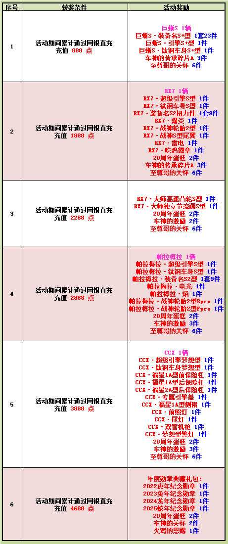 1. 序号1至5活动奖励由系统即时颁发,请在完成相应任务后于游戏中领取;