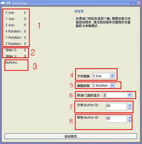 5. 档位设置:随意操作您的方向盘升、降档按键,图片标注3的区域会显示一个数值,此时您只需要将图片标注7、8内的选项数值设置成与图片标注3的区域内的数值相同即可。一般情况下,升、降档按键的定义您可自由设置,前提是您的方向盘硬件拥有众多按键选择。