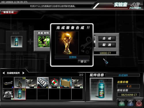 如上图,随意选择3到5件原料配件,点击合成。每次合成需要支付不等的虚拟货币CT作为手续费用。