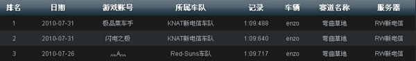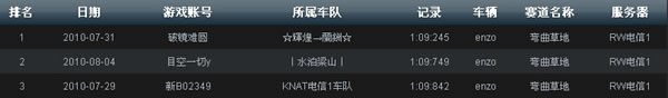 上图为截至8月9日,电信1赛区锦标赛道“弯曲草地”最快单圈记录榜单。“☆辉煌→兰州☆”车队手握1:09:245(恩佐)傲视群雄,该记录同时也是目前的全服冠军记录。“丨水泊梁山丨、KNAT电信1车队”分别以1:09:749、1:09:842稳坐2、3位。