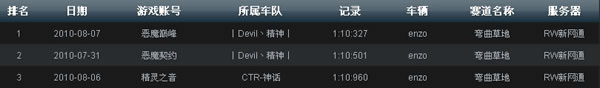 上图为截至8月9日,新网通赛区锦标赛道“弯曲草地”最快单圈记录榜单。“|Devil丶精神|”车队独占两元,以1:10:327(恩佐)、1:10:501(恩佐)领衔。“CTR-神话”车队凭借1:10:960霸占季军位置。