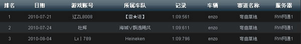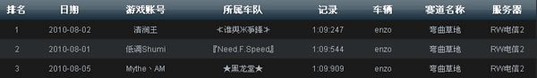 上图为截至8月9日,电信2赛区锦标赛道“弯曲草地”最快单圈记录榜单。“≮谁与Ж争锋≯”车队以1:09:247占据首位,该记录也是目前的全服亚军记录。“『Need.F.Speed』、★黑龙堂★”以1:09:544、1:09:909紧随其后。