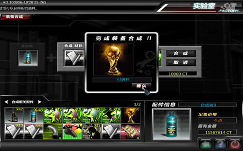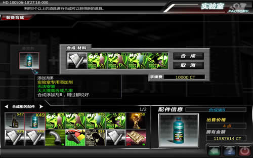 如图4:一般情况下,在点击“合成”按钮前放置一瓶“添加剂”道具,将可以大幅提升该次“图纸合成”的成功几率。目前“添加剂”产品共分3个档次,他们分别是:“添加剂A”(约提高10%的成功率)、“添加剂B”(约提高30%的成功率)、“添加剂C”(在图纸及材料齐备的前提下,保证100%的成功率)。