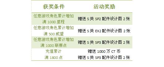 2. 每个通行证帐号最多获得1份活动奖励;1份活动奖励包含S类SP2配件设计图2张、S类EX2配件设计图2张、S类SP3配件设计图4张、1000万CT游戏币;