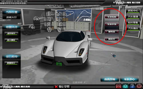 如图2,《飚车世界》总计为您的爱车提供4个类别的车辆装饰装潢配件。它们分别是车体贴纸、车体外饰、装饰物及霓虹灯。