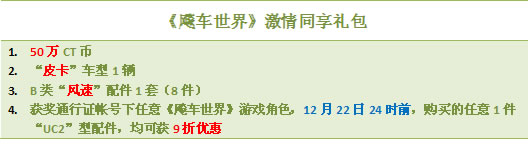 活动奖励:每个符合条件的通行证帐号,将获赠1份《飚车世界》激情同享礼包;