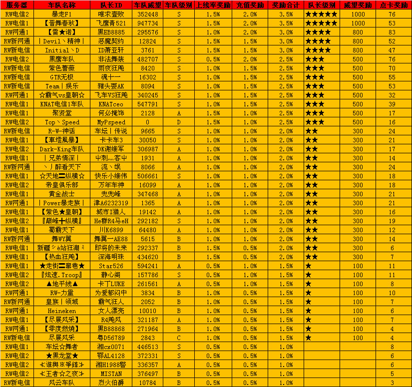 您的车队是否已经在这份激动人心的榜单中登场了呢?下月,这份喜悦是否同样属于您呢?希望大家能够更好的组织好车队的活动,获得我们更多的奖励!