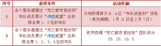 3. 序号2获奖条件中,每个服务器仅限4支获奖车队;当车队所获得的“死亡都市竞技场”团队积分累计满100时,相应车队将可获颁“死亡都市竞技场”车队徽章1枚(由车队队长负责分发);