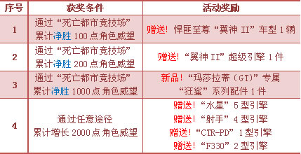3. 当车队所获得的“死亡都市竞技场”团队积分累计满100时,相应车队将可获颁“死亡都市竞技场”车队徽章1枚(由车队队长负责);