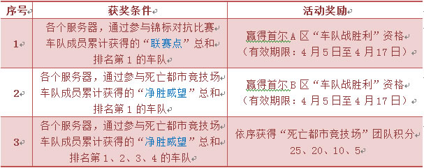 2. 当车队所获得的“死亡都市竞技场”团队积分累计满100时,相应车队将可获颁“死亡都市竞技场”车队徽章1枚(由车队队长负责分发);
