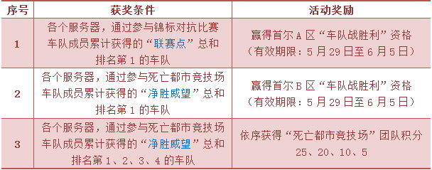 2. 当车队所获得的“死亡都市竞技场”团队积分累计满100时,相应车队将可获颁“死亡都市竞技场”车队徽章1枚(由车队队长负责分发);