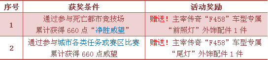 2. 当车队所获得的“死亡都市竞技场”团队积分累计满100时,相应车队将可获颁“死亡都市竞技场”车队徽章1枚(由车队队长负责分发);