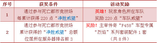 2. 当车队所获得的“死亡都市竞技场”团队积分累计满100时,相应车队将可获颁“死亡都市竞技场”车队徽章1枚(由车队队长负责分发);