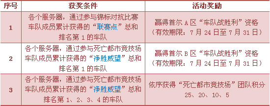 2. 当车队所获得的“死亡都市竞技场”团队积分累计满100时,相应车队将可获颁“死亡都市竞技场”车队徽章1枚(由车队队长负责分发);