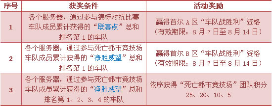 2. 当车队所获得的“死亡都市竞技场”团队积分累计满100时,相应车队将可获颁“死亡都市竞技场”车队徽章1枚(由车队队长负责分发);