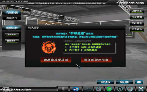 如图2:当您点击“车神追逐”按钮,即可看到一幅醒目的确认提示框。参与“车神追逐”竞技场比赛,您至少需要拥有1000点“角色威望”以及不小于0点的“角色赛点”。“角色赛点”是“车神追逐”竞技场中专用的角色点数,是您在“车神追逐”竞技场中战绩优劣的评定依据。友情提示:任意游戏角色初始拥有1000点“角色赛点”。当您在“车神追逐”竞技场输去的“角色赛点”低至不足以参与比赛时,您可随时至游戏中的“特殊附件”商店“其他”栏目中购买名为“赛点重置券”的特殊道具。每次购买它,都将会即时重置您的“角色赛点”,使之回到1000初始点状态。