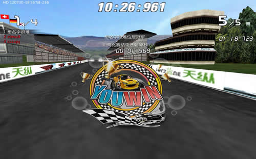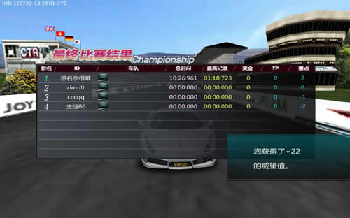 如图4:每场比赛中,共有4名同场参赛选手。每场比赛的起步排位依据参赛选手各自“角色威望”高低降序排列;每场比赛胜负依据最终比赛排位决定。“车神追逐”竞技场同级赛点的角色(即角色赛点差距小于100)胜负收益为:单场比赛中,最终第1位玩家可赢得22点“角色威望”、2点“角色赛点”;第2位玩家可赢得13点“角色威望”、1点“角色赛点”;第3位玩家将输去15点“角色威望”、1点“角色赛点”;第4位玩家将输去25点“角色威望”、2点“角色赛点”。