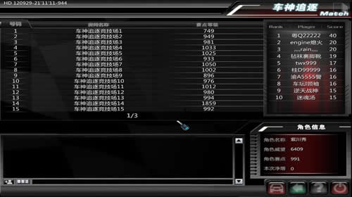 如图3:当您进入“车神追逐”赛区竞技场,这就是您将看到的画面。左侧底部为聊天框、左侧顶部为正在比赛中的房间列表;右侧顶部为本次“车神追逐”竞技场即时赛点净胜榜(前10)、右侧底部则为“您的角色信息”。