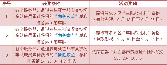 2. 当车队所获得的“死亡都市竞技场”团队积分累计满100时,相应车队将可获颁“死亡都市竞技场”车队徽章1枚(由车队队长负责分发);