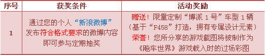 2. 《飚车世界》官方微博将在届时公布获奖的新浪微博帐户,并通过新浪微博私信向获奖者索取其《飚车世界》通行证帐号(无需密码),以完成奖励颁发;