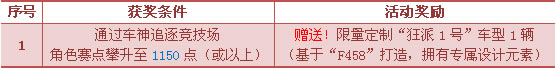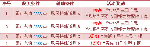 5. 参与范例:活动期间,假设您累计充值了2888点,并购买了特殊道具A、C各1件,您即可在活动结束后获赠“F458”车型专属“烈焰”系列3型扭力类配件1套以及“博派1号”车型1辆;