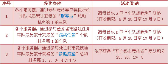 2. 当车队所获得的“死亡都市竞技场”团队积分累计满100时,相应车队将可获颁“死亡都市竞技场”车队徽章1枚(由车队队长负责分发);