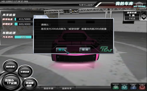 如图4、5、6、7所示:当“威望保镖”装配完毕后,您还需为其进行能量充值方可正式使用。任何玩家均可在“车库”中,随时为“威望保镖”进行能量充值。“威望保镖”能量充值采用游戏点数等额兑换相应能量点数的方式。目前,单次最小支付200点游戏点数充值200点“威望保镖”能量点数。