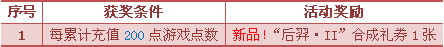 礼券功用:每收集5张“后羿.II”合成礼券,通过“研发中心”“实验室”,配合添加剂道具进行装备合成,可有机会获得“后羿”系列2型套装配件1件。
