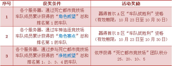 2. 当车队所获得的“死亡都市竞技场”团队积分累计满100时,相应车队将可获颁“死亡都市竞技场”车队徽章1枚(由车队队长负责分发);