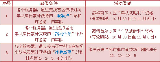 2. 当车队所获得的“死亡都市竞技场”团队积分累计满100时,相应车队将可获颁“死亡都市竞技场”车队徽章1枚(由车队队长负责分发);