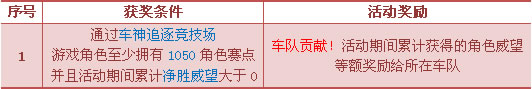 3. 本活动奖励以“车队威望”形式颁发,颁奖对象取截至颁奖时相应角色所在车队;