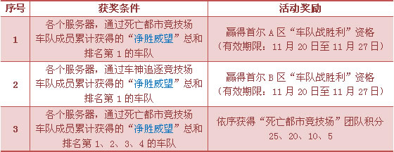 2. 当车队所获得的“死亡都市竞技场”团队积分累计满100时,相应车队将可获颁“死亡都市竞技场”车队徽章1枚(由车队队长负责分发);