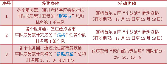 2. 当车队所获得的“死亡都市竞技场”团队积分累计满100时,相应车队将可获颁“死亡都市竞技场”车队徽章1枚(由车队队长负责分发);