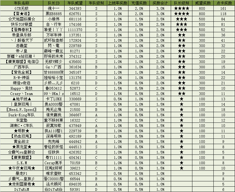 您的车队是否已经在这份激动人心的榜单中登场了呢?下月,这份喜悦是否同样属于您呢?希望大家能够更好的组织好车队的活动,获得我们更多的奖励!