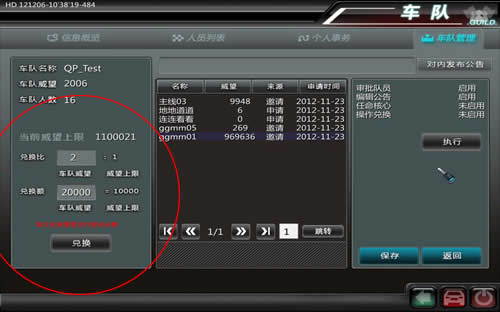 如图11:如果您是一名车队队长(或已被授权的其他队内成员),当您进入“车队中心”、“车队管理”板块,即可看到左侧的“属性兑换”功能界面。在其中,您可通过支付一定车队威望以及游戏点数的方式,为您车队的全体成员带来更高的游戏角色威望上限。