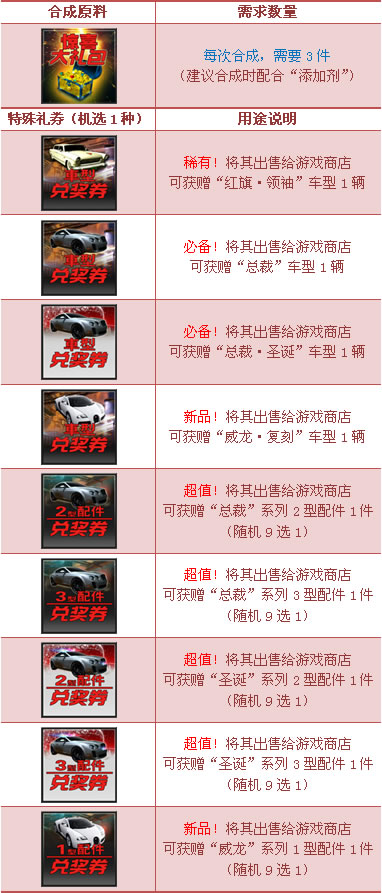 您只需收集3件“惊喜礼包”特殊道具,通过实验室进行装备合成,即可有机会获得若干种类的“特殊礼券”之一。在指定活动期间,将所获得的“特殊礼券”售卖给游戏中的“特殊附件”商店,您即可在相应活动结束后获赠该“特殊礼券”对应的活动奖励内容。