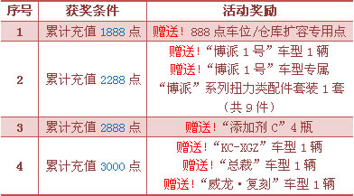 (例如:只需活动期间累计充值3000点点数,您即可获赠本活动所有活动奖励各1份)