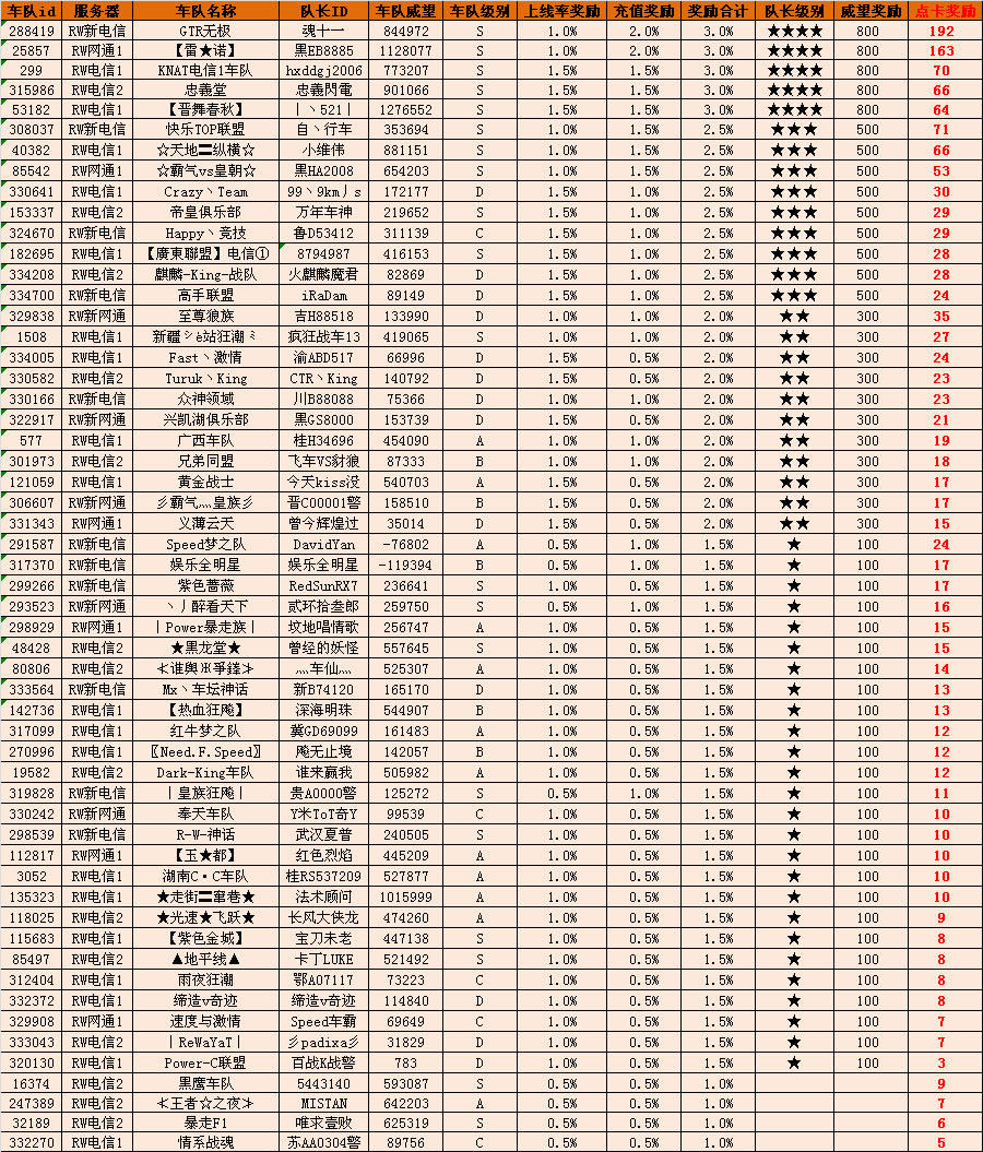 1. 点卡奖励还是按照相关规则:由车队队长负责分配;