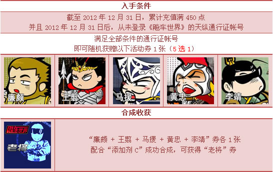 友情提示:本活动涉及的5种活动券(廉颇、王翦、马援、黄忠、李靖),将在4月22日前逐批颁发给满足条件的天纵通行证帐号。届时每个天纵通行证帐号可随机获赠其中之一,敬请查收!