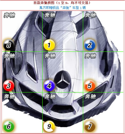 活动内容:通过“中秋欢乐活动2”,参与活动抽奖。只需集齐全套(9张)“首款奔驰拼图”活动道具,即可在活动结束后获赠1辆充满男人气概的极品“奔驰”车型!