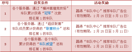 3. 活动期间,假如多支车队获得的“横冲直撞竞技场”冠军次数相同,则取车队威望最高的那支车队为获奖车队;车队威望数据截至活动数据统计时;