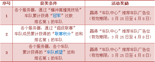 3. 活动期间,假如多支车队获得的“横冲直撞竞技场”冠军次数相同,则取车队威望最高的那支车队为获奖车队;车队威望数据截至活动数据统计时;